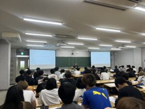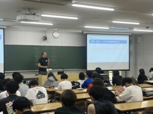 6月6日は、スポーツプログラマー ジュニアスポーツ指導員、スポーツ施設管理士、スポーツ審判員など健康スポーツ科学科で取得が可能なスポーツ系資格の取得方法について説明をうけました。授業はオムニバス形式で、13日は健康にかかわる資格 、20日は教職に関する資格について行われます。