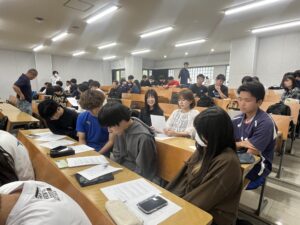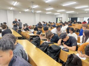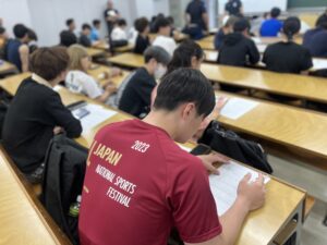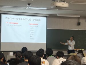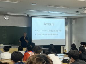 指導者に必要な専門的知識や指導技術を身につけ、社会人として活躍できるよう、各授業を担当する教員からも、資格と授業のつながりや指導者に必要な力について話され、学生は真剣な表情で受講していました。