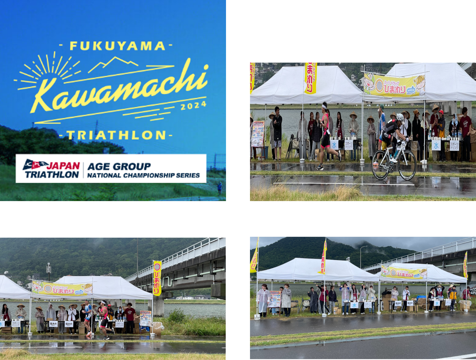 2024年6月9日(日)、福山市芦田川を中心に「福山かわまちトライアスロン」が開催されました。雨模様の中、スイムコース1.8㎞、バイクコース80㎞、ランコース18㎞を全国から集結したトライアスロンアスリートが競い合いました。
