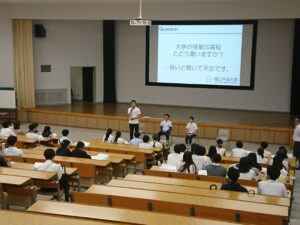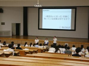 「クラブ活動と勉強、アルバイトの両立はできる?」、「座学と実技授業の割合は?」「どんな授業が印象に残っている?」「学生生活で楽しいことは?」など様々な質問に、学生たちは自身の経験をもとにしっかりと伝わるよう生徒たちに向け答えていました。