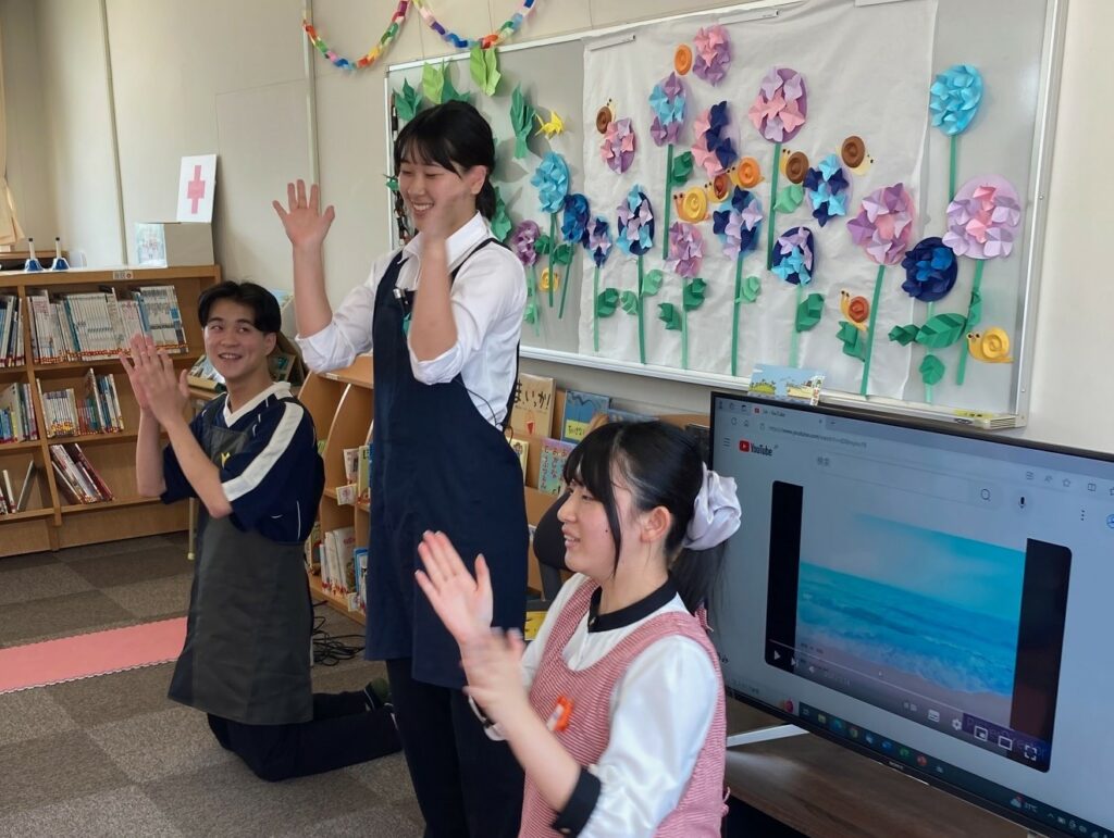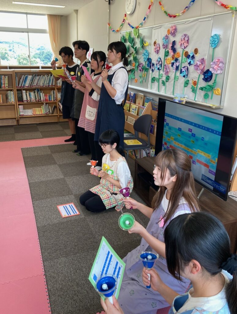 川島ゼミの学生は、中学部・高等部の生徒の皆さんが参加する時間を担当し、絵本「あついあつい」の朗読、ミュージックベル「うみ」の演奏、大型絵本「うみの100かいだてのいえ」の朗読という夏らしい演目をお届けしました。絵本の読み聞かせ活動の取り組みは、こどもを受け止める感性や表現力を培う体験になっています。