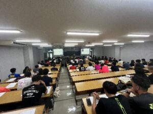 本日は1年生を対象とした基礎演習で、定期試験にむけての説明が峯田講師から行われました。1年生にとっては初めて受ける大学での定期試験です。様々なルールや仕組み、単位認定について確認されました。