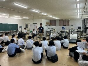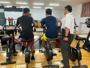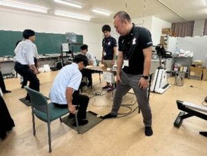 石井助教の模擬授業では、運動前後の学生のサーモグラフィーをみて、深部体温が上がっていること、表面の体温は発汗で熱を放散させていることなどの説明がされました。たくさんの機器を使っての体力測定も学生リーダーが説明を行って、生徒の皆さんに体験してもらいました。