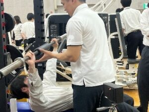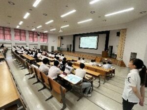 本日の学科イベントとして「楽しい体育授業を考えよう」をテーマに阿部直紀講師が模擬授業を行いました。参加してくれた生徒たちはグループに分かれて座り、学生リーダーがサポートに入りました。グループ活動では、付箋に書いた皆の意見を画用紙に貼り付けてまとめる作業をして、発表し合いました。またすべての意見はAIによるテキストマイニングでも示され、試合、協力などのキーワードが多かったことなどが示されました。