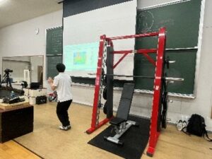 午後の学科イベントは、「自分の体を知り、鍛えてみよう」をテーマに高本健彦准教授と石井智紋助教により2会場に分かれて模擬授業が行われました。