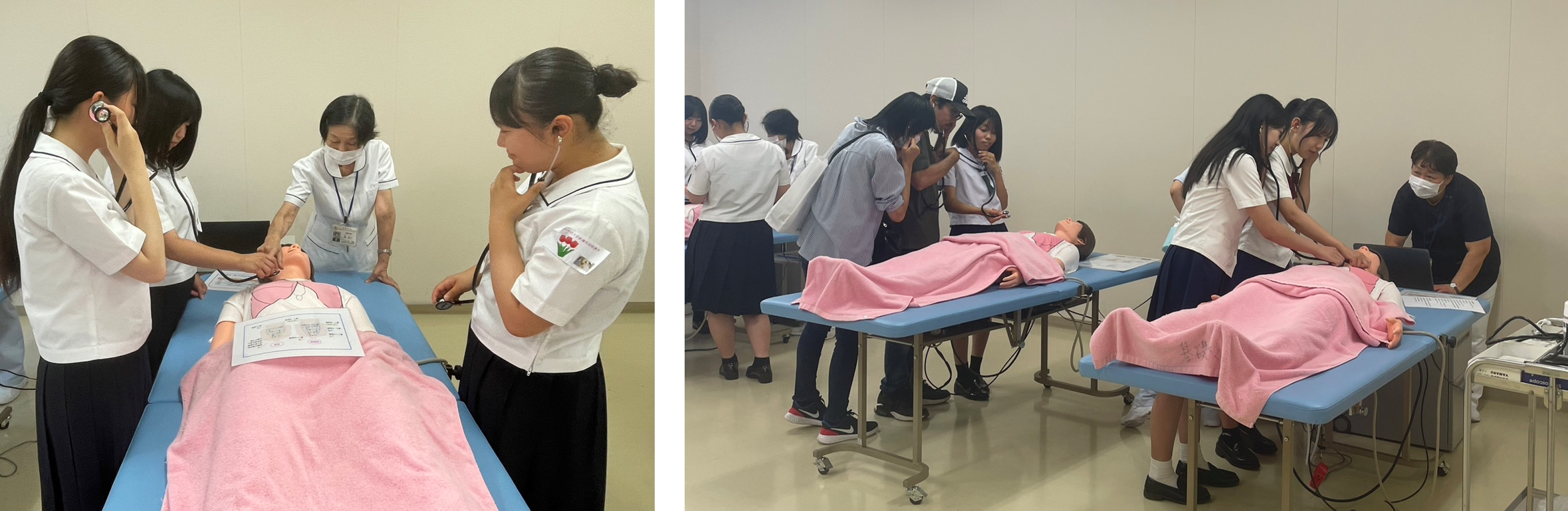 その後、「ナーシングスキル・プチ・トレーニング」では聴診器を使って呼吸音・腸音を聴取してを体験していただきました。皆さん、初めて触る聴診器にドキドキされていました。