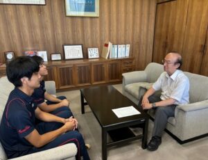 軟式野球部 全日本大学軟式野球選抜大会出場へ! | 学科ニュース|福山平成大学 (heisei-u.ac.jp)本学科の高本健彦准教授(監督)、浅野元蔵さん(健康スポーツ科学科4年)、渡邉壮太さん(健康スポーツ科学科3年)が、学長室を表敬訪問し、大会出場に向けて激励のお言葉をいただきました。