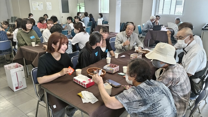 講座の前後のお茶とお菓子を提供するカフェでは、学生たちが地域の参加者の方々と歓談したり、講義内容について学びを共有する様子が見られました。