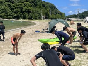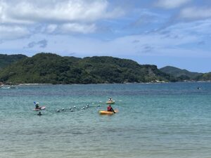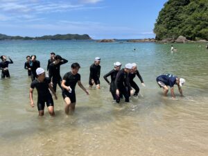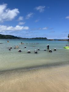 初日は海に慣れることが一つの目標でしたが、1時間半ほど泳ぎ続けて隣の岸にたどりついた班もありました!