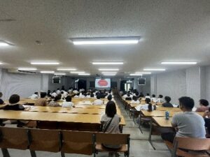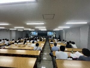 8月17日のオープンキャンパスには健康スポーツ科学科に170名近くの皆様にお越しいただきました。予定した教室のみでは手狭となるため,健康スポーツ科学科のオープンキャンパス参加者を二つの教室に分けてオンラインでつなぎ入試説明などが行われました。
