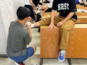 話を聞いた後、生徒同士でペアになり、お互いの足に捻挫予防のテーピングを行いました。そして巻いた後で足を動かして、テーピングの出来栄えをチェックしてもらいました。