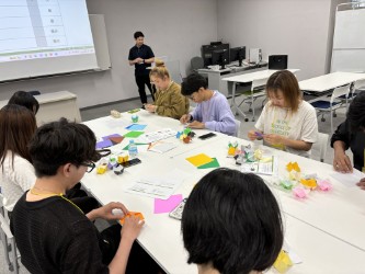 本学学生と助け合って折り紙作りをし、共同作業の楽しさを味わいつつ、会社のお金の動きを学んでもらいました。