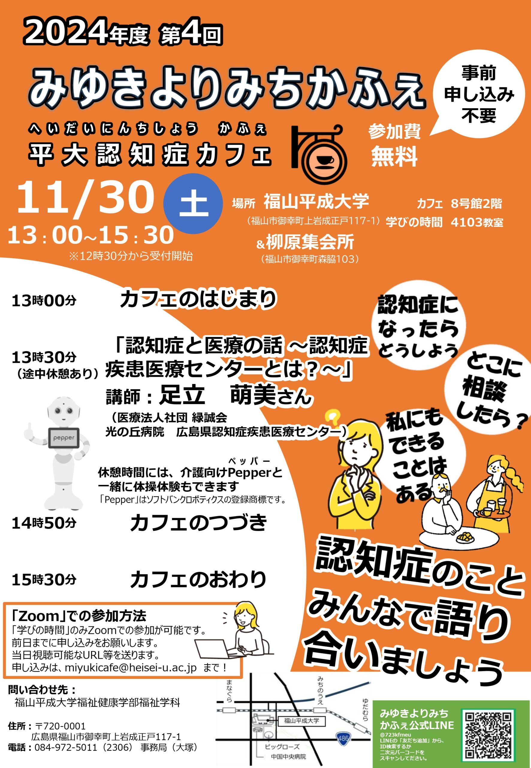「平大認知症カフェ(愛称:みゆきよりみちかふぇ)」のご案内11月30日(土)13:00~、「平大認知症カフェ(愛称:みゆきよりみちかふぇ)」(参加費無料)を、福山平成大学4103教室で開催します。今回のカフェの内容は