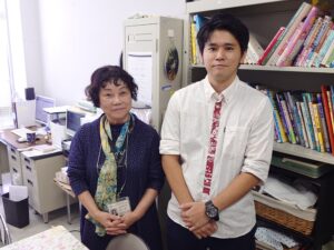 スポーツ企業情報演習で卒業生による講話の第2回目が10月30日(水)に行われ、青木勇人さん(健スポ10期生:三原特別支援学校教諭)にご登壇いただきました。(写真:ゼミの指導教員である中村教授と青木さん)