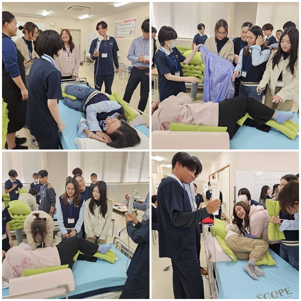 福祉学科の4年生がポジショニングや体圧分散、除圧の方法をモニターで確認しながらレクチャーしました。