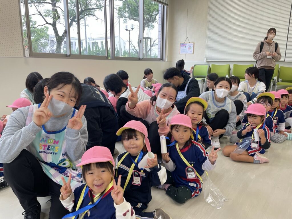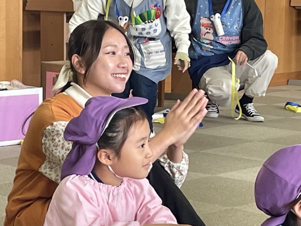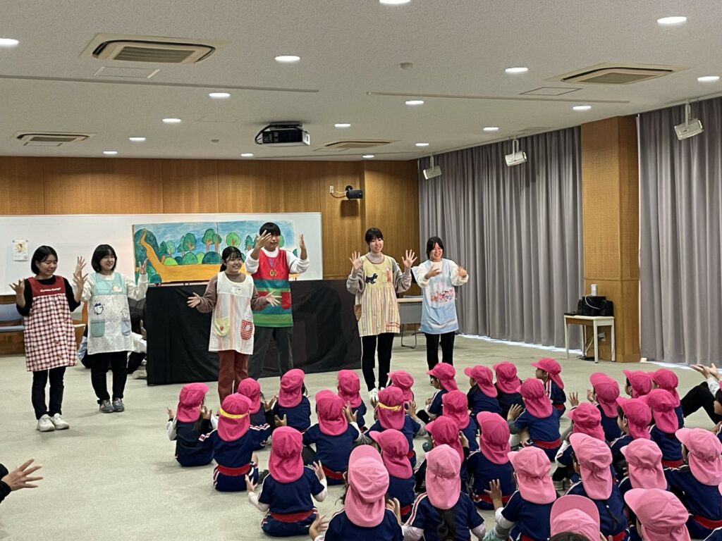 11月1日は白ゆり幼稚園から3歳さんが54名来てくれました。学生の演じるペープサートを見たり、一緒に落ち葉の製作を楽しんだりしました。