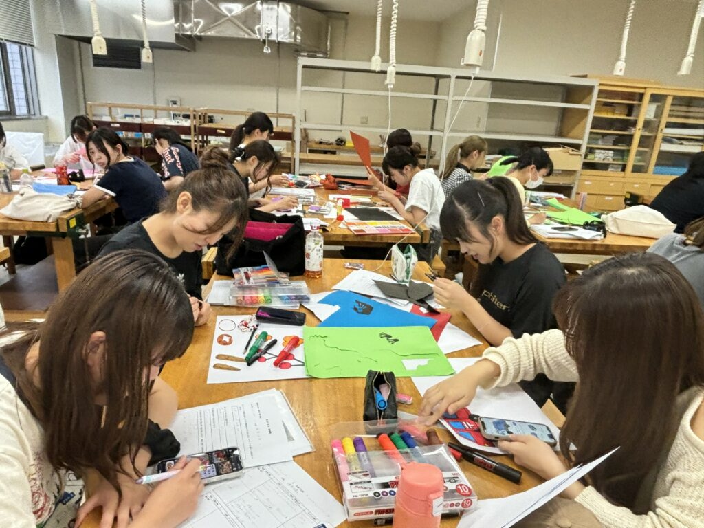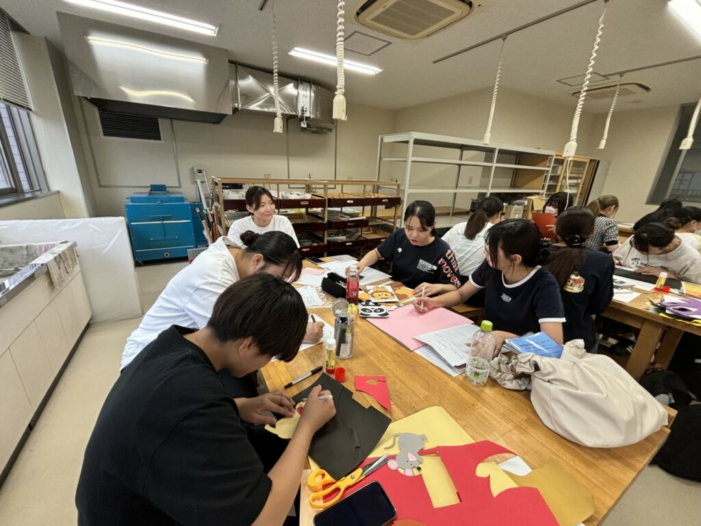 保育士や幼稚園の先生、こども園の先生を目指す学生たちは、「保育実地体験Ⅱ」の授業で、子どもたちの前で発表するためのスケッチブックシアターやペープサート、紙芝居などを作りました。