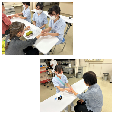 中川名帆子准教授(メディカルアロマプラクティショナー)より、アロマに関するお話があり、その後、2年生による精油を使った足浴とハンドマッサージが行われました。