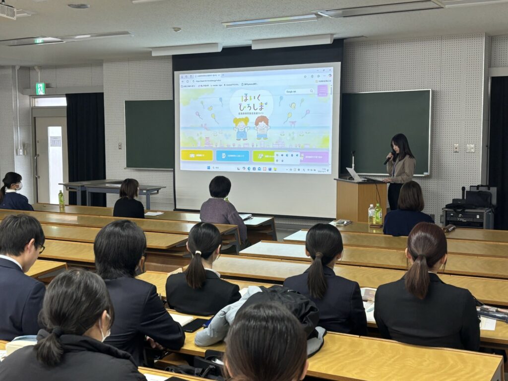 まずは、広島県健康福祉局の方から広島県保育総合支援サイト「ほいくひろしま」の説明を受けました。サイトにアクセスすると、スマホで園の情報を調べることができ、来年度の就活で活用できます。