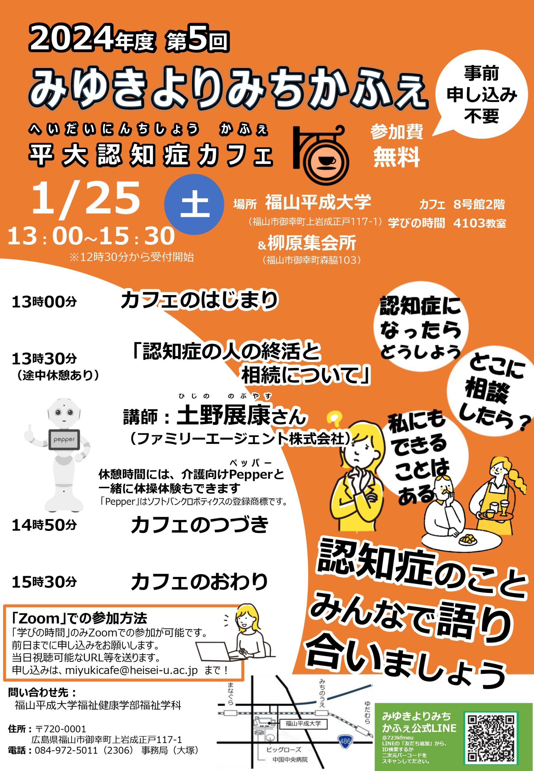 1月25日(土)13:00~、「平大認知症カフェ(愛称:みゆきよりみちかふぇ)」(参加費無料)を、福山平成大学4103教室で開催します。今回のカフェの内容は「認知症の人の終活と 相続について」