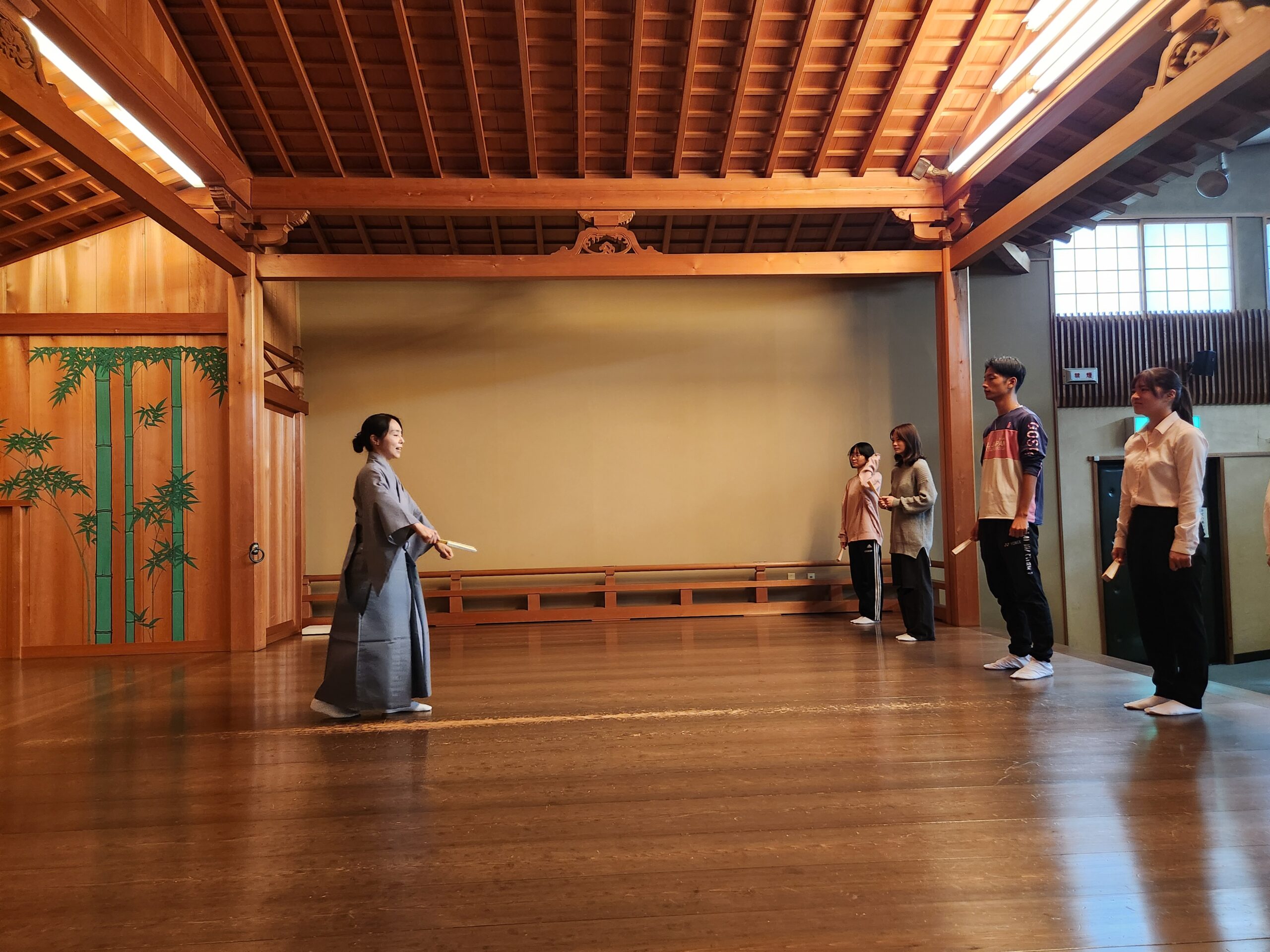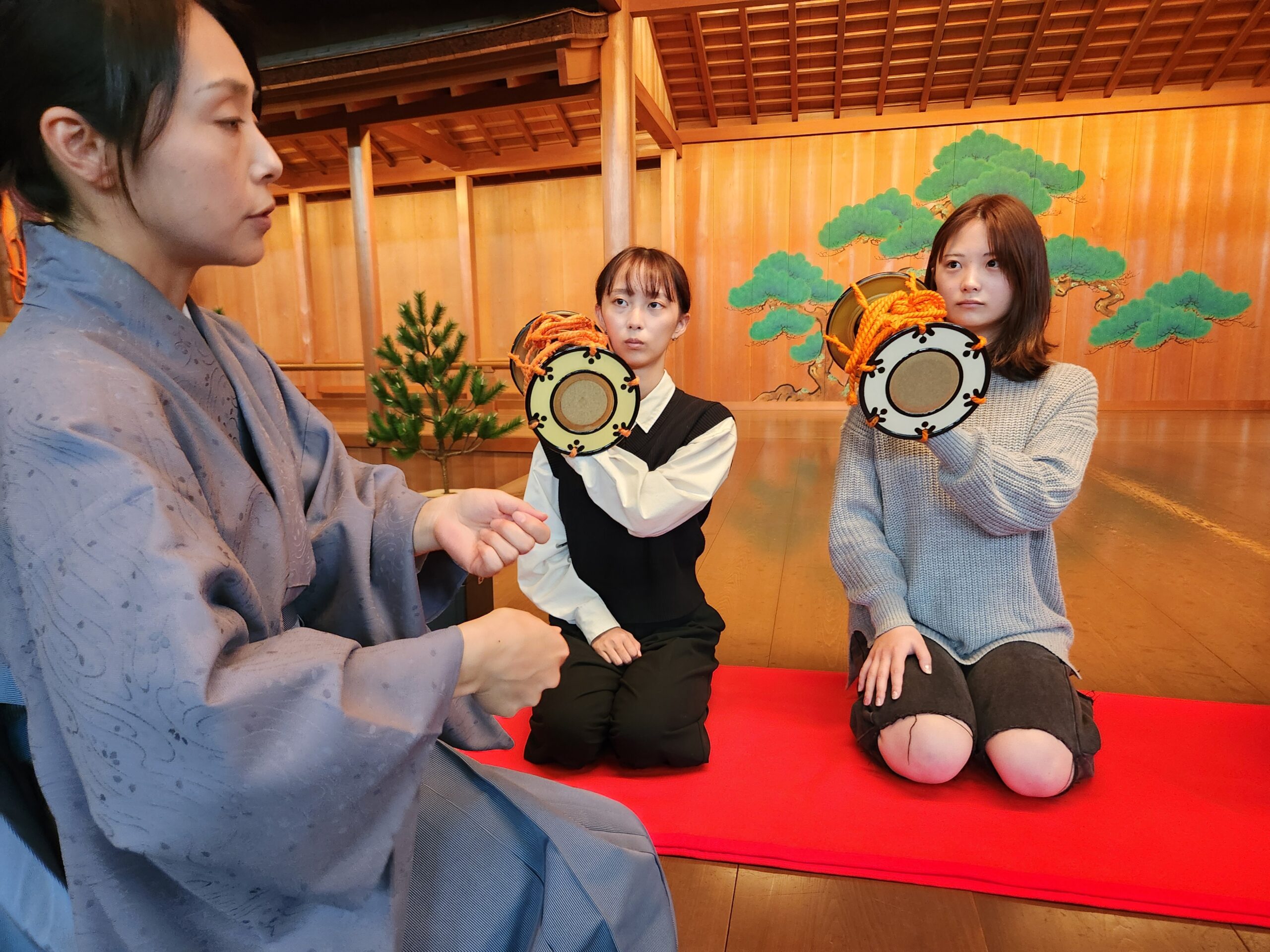 「初等音楽科教育法」での「能楽堂体験」の様子です。謡や能の所作など学生たちが体験しました。