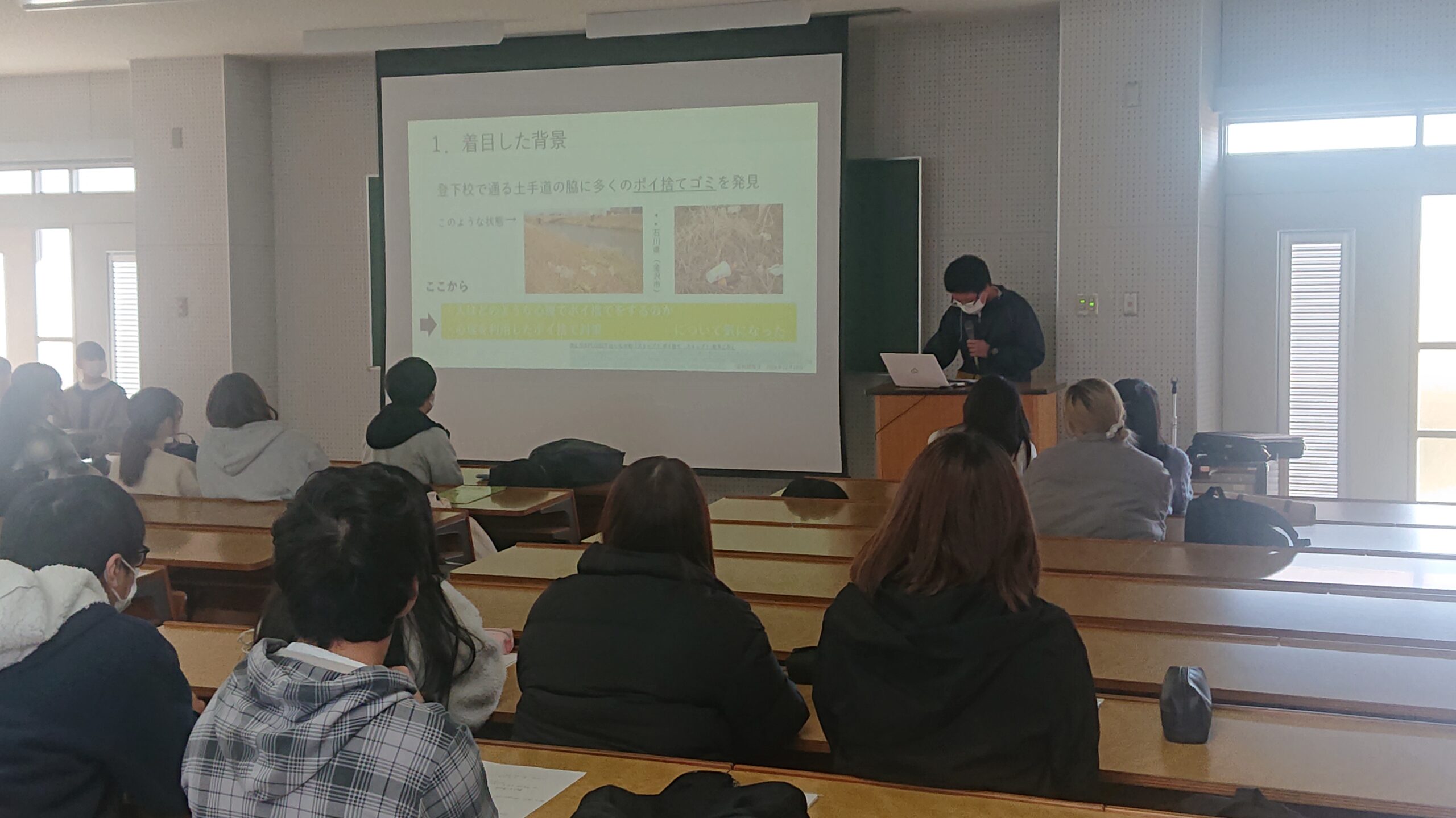 12月、1年生は「SDGs」に基づいたテーマを自ら設定し、5分間の発表を行いました。学生たちは、資料作成や発表の準備を友人と相談しながら進めていました。