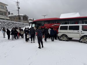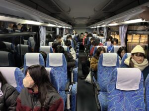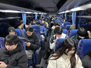 早朝6時の開講式後,バスに乗り込みスキー実習に出発しました.