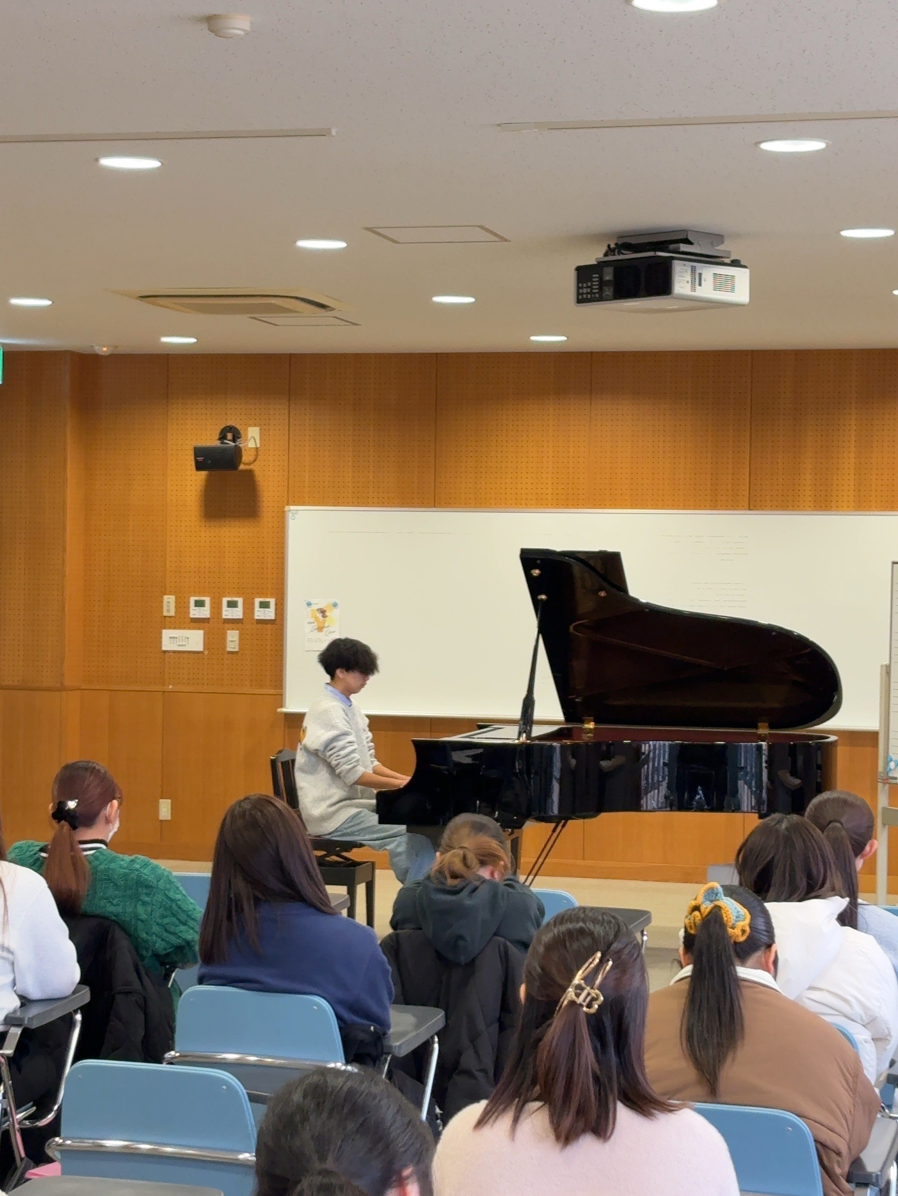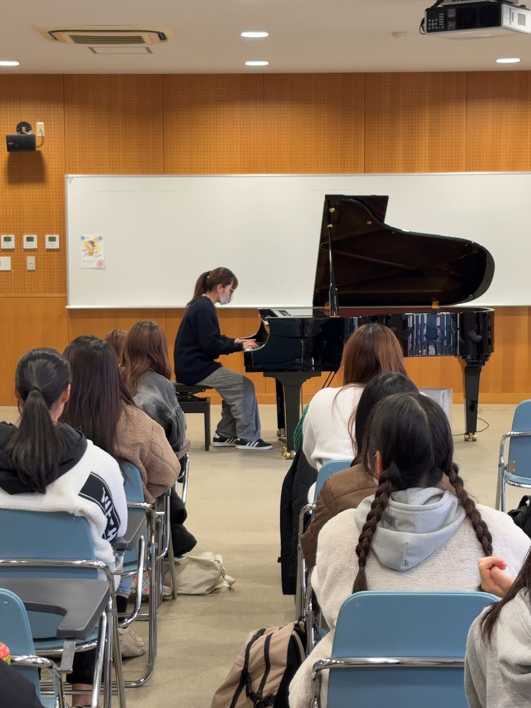 大学でピアノを学ぶ授業の一つになる「ピアノ奏法」では、4月から7月の前期、9月から1月の後期、それぞれ半期につき6曲の課題曲があり、その試験として、当日1曲を指定し演奏します。その時は、暗譜での演奏が必須となっています。学生たちの様子を見ていると、ピアノ演奏の経験の差はありますが、それぞれ練習を重ね、全く弾けないという学生はいないです。これも、こども学科のピアノの先生方の指導のおかげですね!
