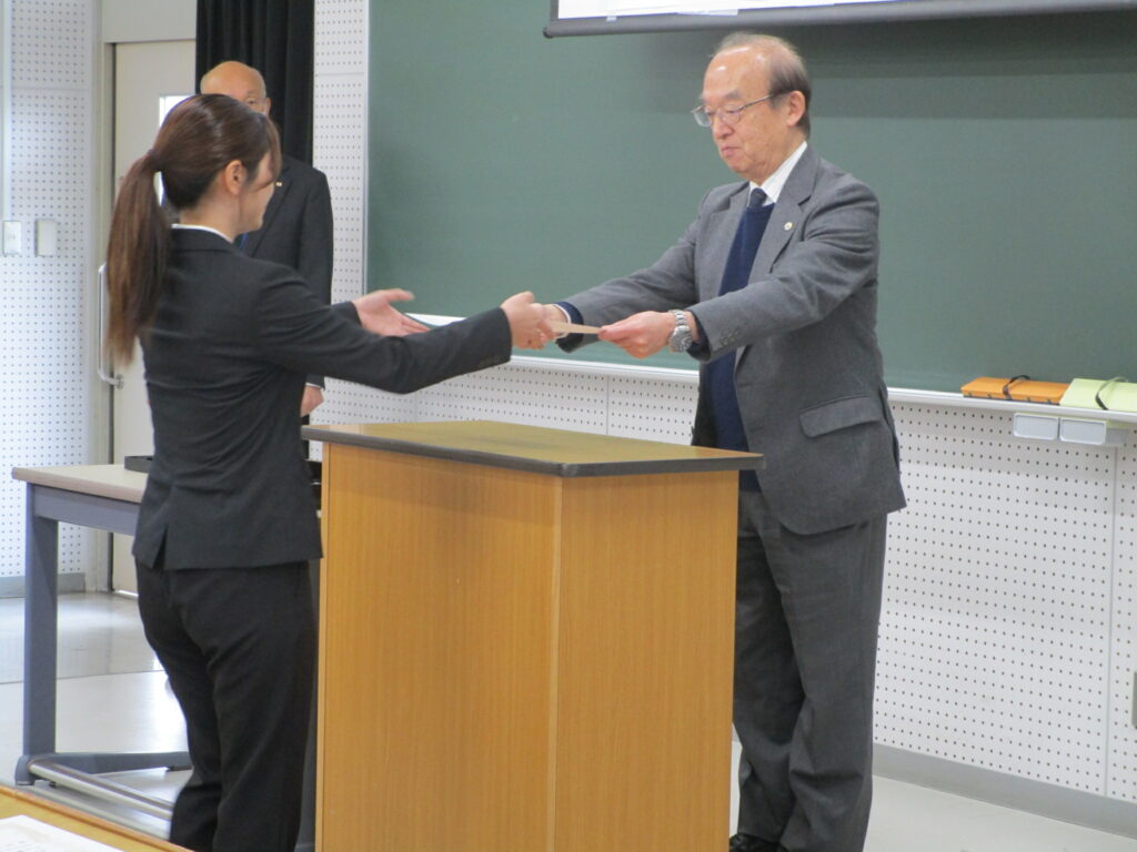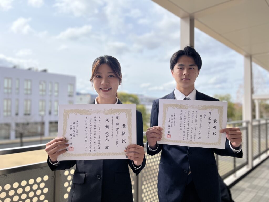 また、学長表彰(スポーツ部門)においては、3年連続表彰された4年生の犬飼さん(ソフトテニス)と1年生の黒岩さん(男子バレーボール)が表彰されました。