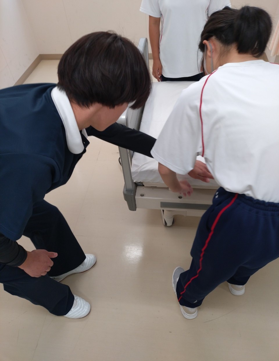 講義は、介護助手の仕事内容とベッドメイキングでのシーツ交換のポイントについて説明しました。演習は、実際に敷いているシーツをとる、新しいシーツを広げる、四隅を三角コーナーに折りたたむ実技を4年の学生たちのサポートの元で実践しました。三角コーナーのつくり方は何度も練習しましたが、とても大変だったと思います。シーツにしわがあると、寝心地の悪さや褥瘡の原因にもなります。4年の学生たちのサポートを受けながら一生懸命にしわをつくらないように取り組む姿は、見ていてとても素晴らしかったです。