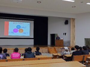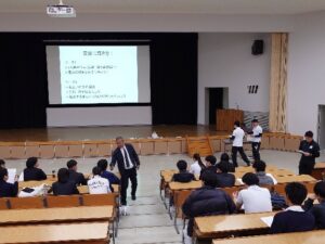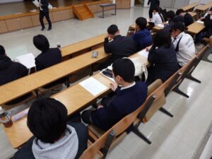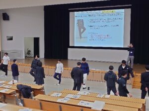2つ目の模擬授業では、コーチ学が専門でサッカー部顧問を務めている若井講師による『コーチングについて考えよう』というテーマのもと、コーチ(指導者)として、選手にどのような声掛けをしたらよいかについて、自己紹介・他者紹介を用いたコーチングを体験しました。