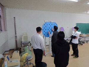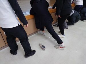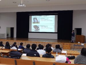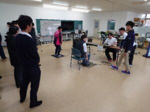 3つ目の模擬授業では、アスレティックトレーナーとして活躍されている峯田講師による「怪我をしやすい体かを調べてみよう」というテーマのもと、100円ショップなどで手に入る道具を使って怪我の原因となる「リスクファクター」があるかを調べてみました。