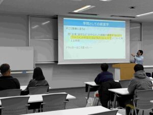 3/15(土)に春のオープンキャンパスが開催されました。前半には、堀越経営学科長による学科紹介では、経営学科の取り組みや、「経済」と「経営」について説明されました。次に、在学生によるキャンパスライフの紹介では、卒業式が間近となっている4年生が自らの大学生活を振り返りながら、高校生の皆さんにアドバイスをしていました。