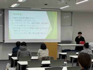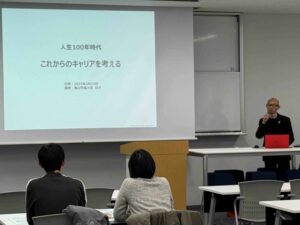 後半では、兒子准教授によるミニ授業「人生100年時代―これからのキャリアを考える」が行われ、残りの時間で、参加者は学生スタッフと歓談をしました。
