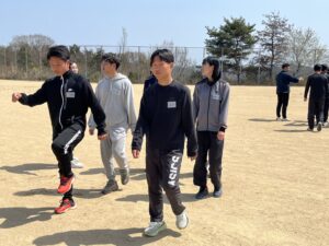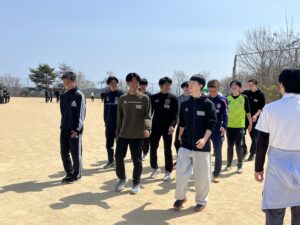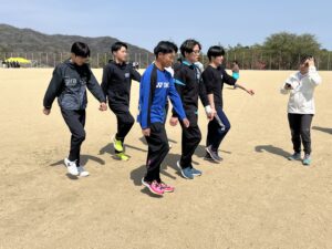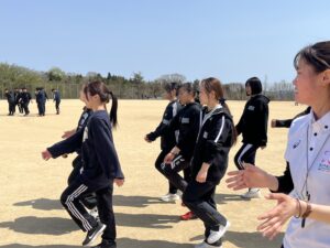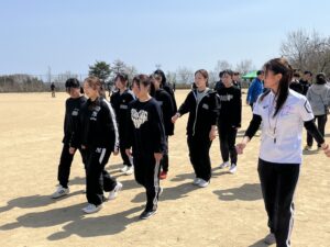 その後、1年生はグラウンドに出て3つのグループに分かれて練習開始!