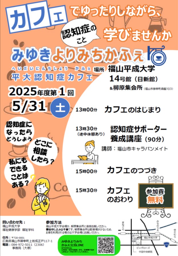 5月31日(土)13:00~、「平大認知症カフェ(愛称:みゆきよりみちかふぇ)」(参加費無料)を、福山平成大学14号館(日新館)で開催します。