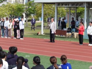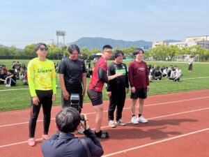 5月15日(木)は開学記念日で、恒例の学長杯争奪競技大会が開催されました。開会式では、冨士学長の挨拶のあと、健康スポーツ科学科3年の水津さん、岡田さん、井手之上さん、紙下さん、陰山さんの5名が、元気でユニークな選手宣誓を行い、場を沸かせてくれました。