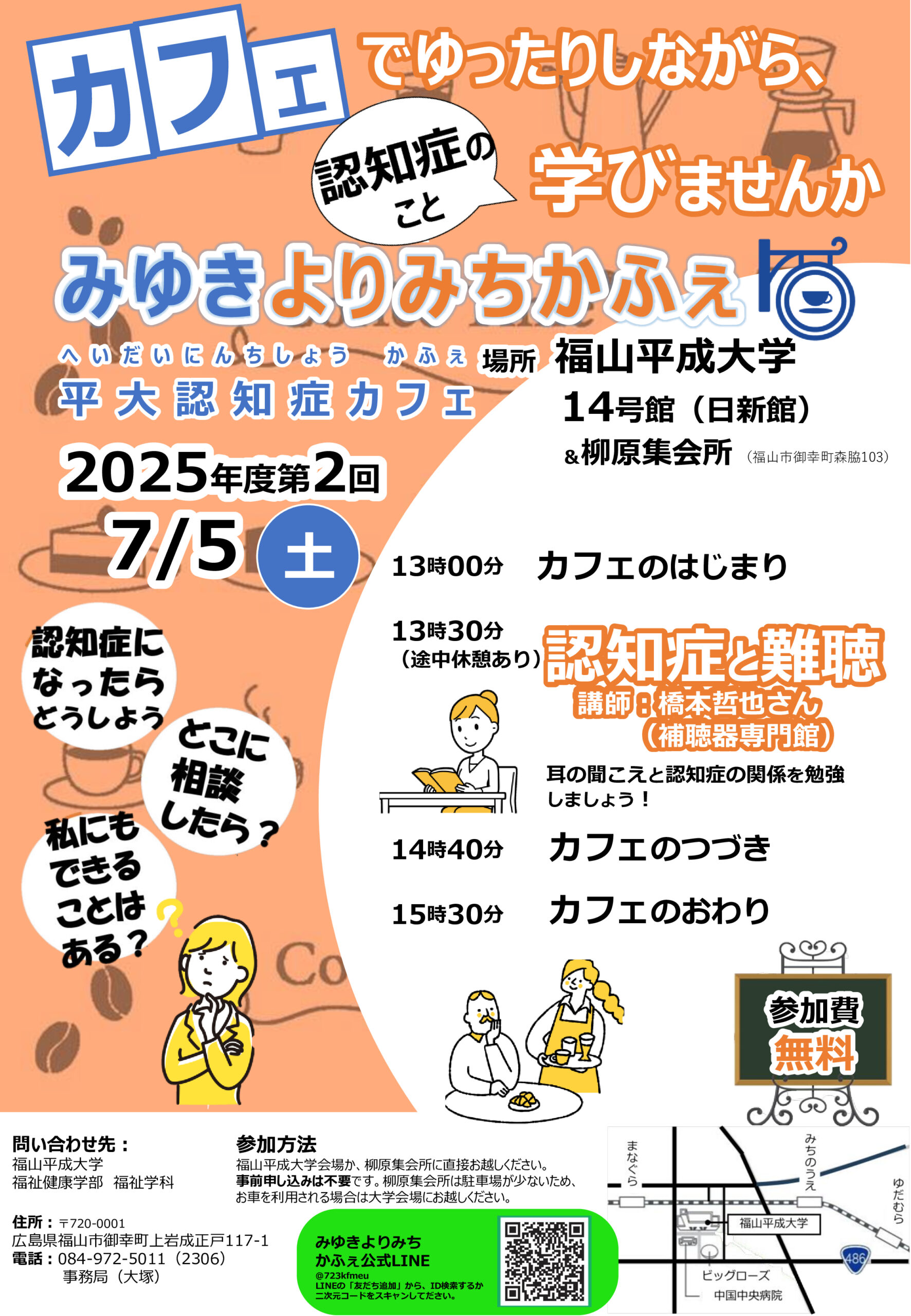 7月5日(土)13:00~、「平大認知症カフェ(愛称:みゆきよりみちかふぇ)」(参加費無料)を、福山平成大学14号館(日新館)で開催します。今回のカフェの内容は「認知症と難聴―耳の聞こえと認知症の関係を勉強しましょう―」