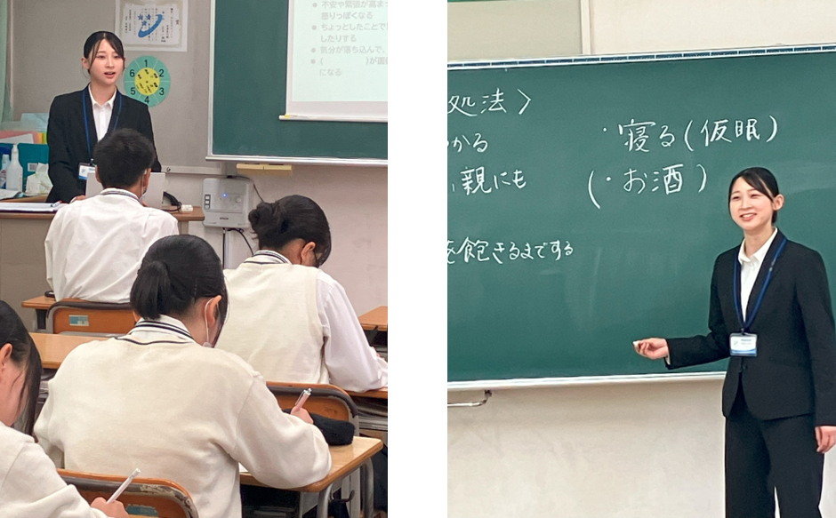 4年生の教職課程の学生が、養護教諭実習の一環として中学3年生を対象に「ストレス管理」をテーマとした保健指導を行いました。