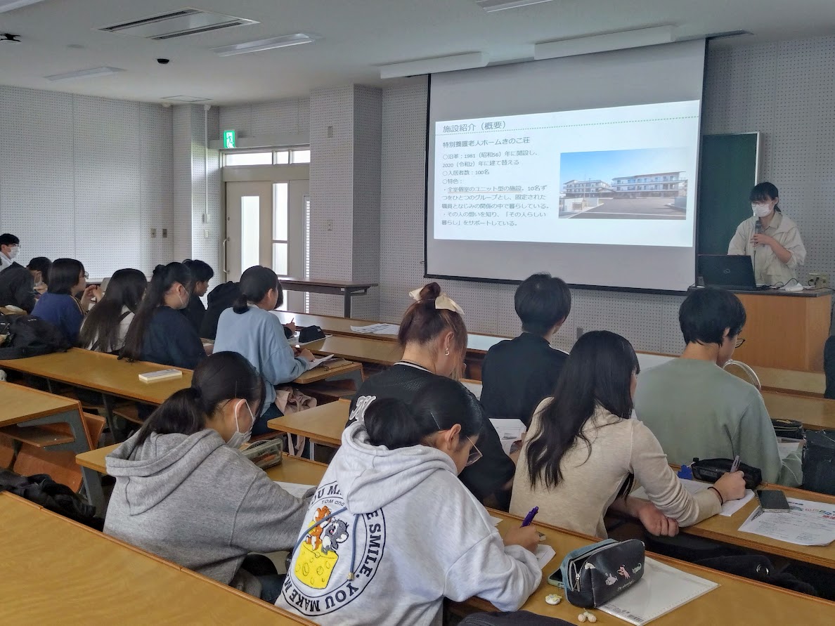 今回は、福祉学科の卒業生である 栗原夏海様、木山真充様(社会福祉法人静和会 障害者支援施設大日学園)、三宅ひかり様(社会福祉法人新生寿会 特別養護老人ホームきのこ荘)の3人をゲストスピーカーとしてお招きしました。