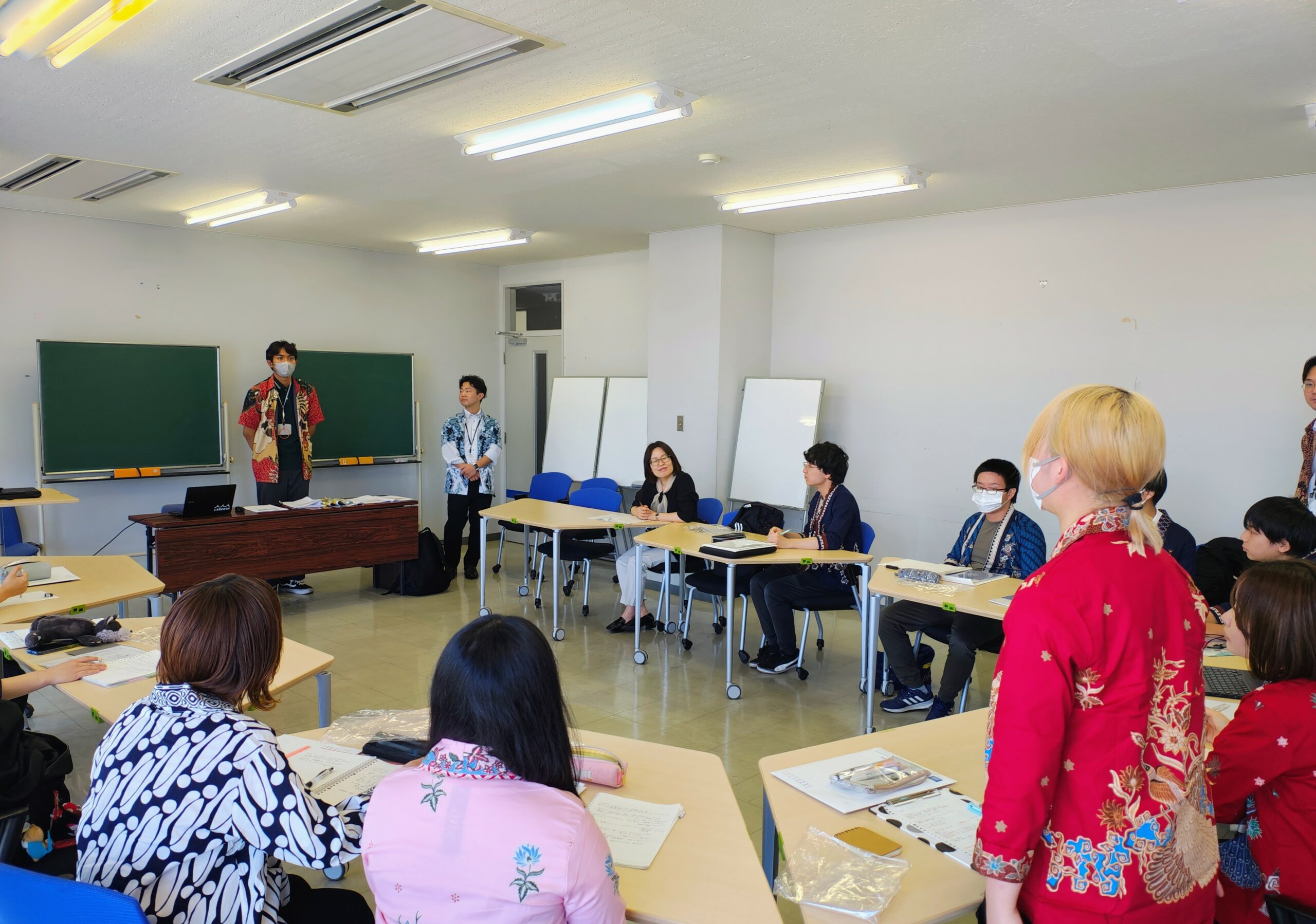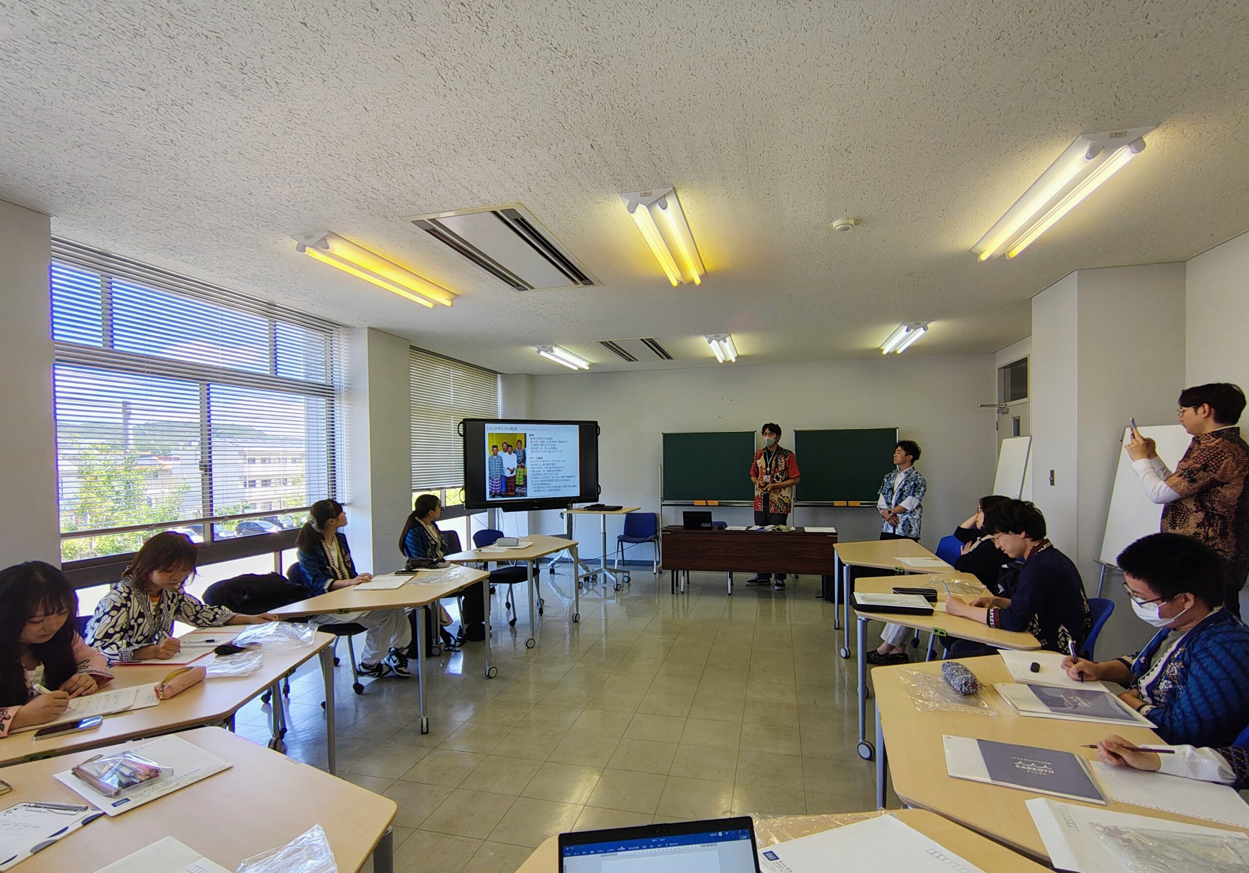 6月26日(木)キャレオスホールディングス株式会社の松井亨介様、三村俊輝様、イ ケトゥト アグス プルナ ウィジャヤ様をゲストスピーカーとしてお招きし、インドネシアの文化と福祉について学びました。講義の前に、インドネシアの民族衣装であるバディックを紹介していただき全員で着用し受講しました。