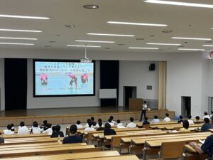 体験後に、柴山 慧准教授から障害のあるないにかかわらず同じ場で共に学ぶことを追求するインクルーシブ教育の大切さについて説明され、 パラスポーツは「見ているだけだと感動で終わる」「やってみるとすごさや面白さがわかる」こと、「体育には多様な意義や価値観があり、身体活動を通じて経験できる」など保健体育科教諭の魅力を紹介されました。