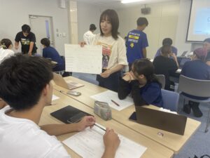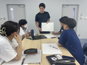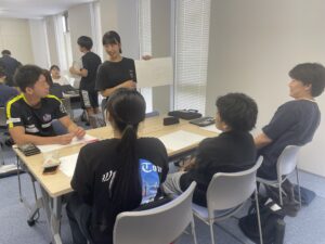 写真の様子は、体つくり運動を教材にして、学生が自分で考えた内容を先生役になりきって5分間で説明する模擬授業です。学生は、4年生での教育実習や、将来教員になったときのために、日々の授業でこのような実践を繰り返しています!