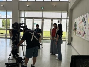 「テレビ新広島(TSS)」の『満点ママプラス』から取材クルーが訪れ、学生へのインタビューや模擬授業の様子などが撮影されました。