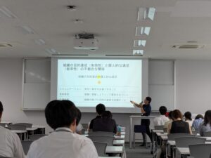 それから、模擬授業に入りました。今回は、組織の目的達成と、その構成員である個々人の満足が一致しないことが多い中、両者の両立を模索する講義でした。