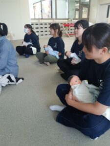 ・小野教授による「乳児保育の実践」では、0歳から3歳未満の乳児の保育理論の基礎と実践を学び、赤ちゃん人形を抱っこしたり衣服の着脱をしたりして赤ちゃんと接する疑似体験をしました。