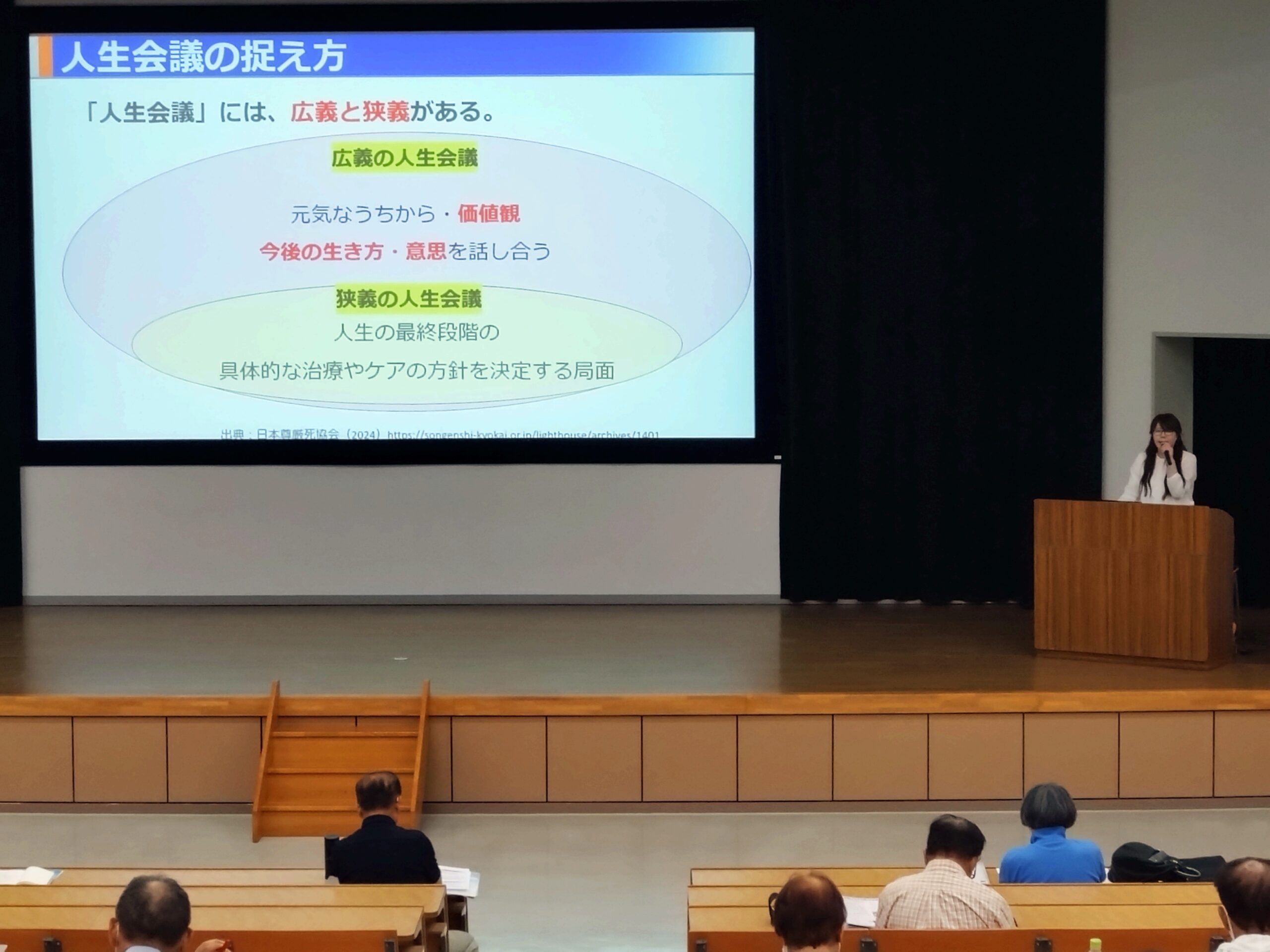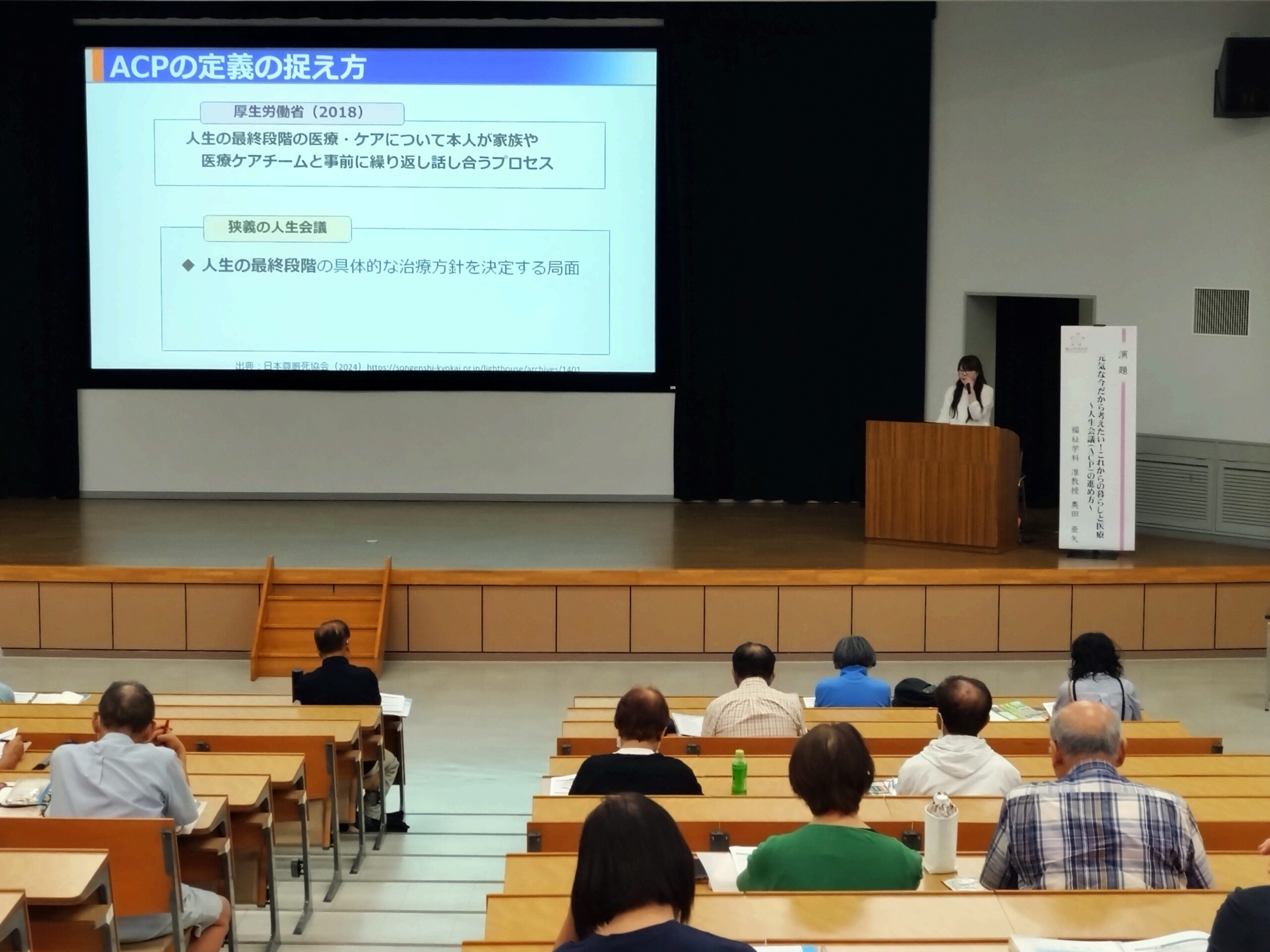 講演では、まず、アドバンス・ケア・プランニング(ACP)について説明がありました。ACPとは、厚生労働省は「人生の最終段階の医療・ケアについて本人が家族や医療ケアチームと事前に繰り返し話し合うプロセス」と定義しています。2018年から、「人生会議」と愛称を定められました。
