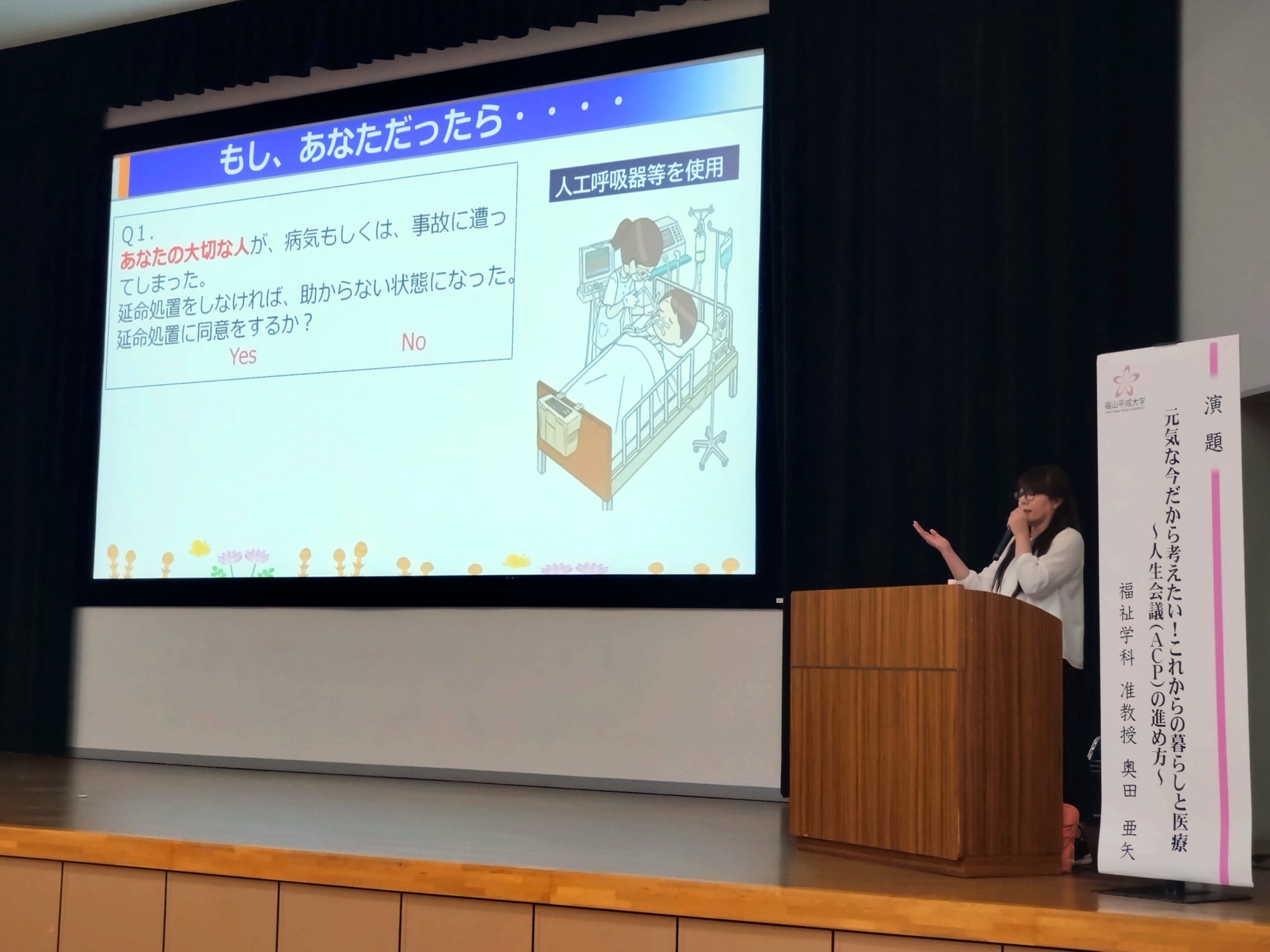 9月4日(木)の第2講座では、「元気な今だから考えたい!これからの暮らしと医療~人生会議(ACP)の進め方~」というテーマで、福祉学科の奥田亜矢 准教授の講演が行われました。約50名の方が参加されました。