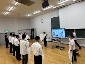 応急手当の中でもファーストエイドに分類される止血や骨折時の固定を実際にやってみる内容でした。いつどこで救急の場面に出会うかわかりませんが、道具が揃っていなくても、身近なものを活かして手当を行うことができ、傷病者の苦痛の緩和や早期の回復に繋がることを学ぶ授業でした。