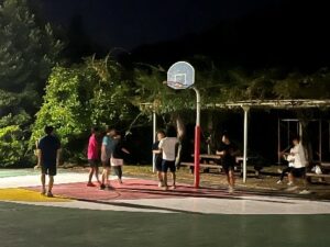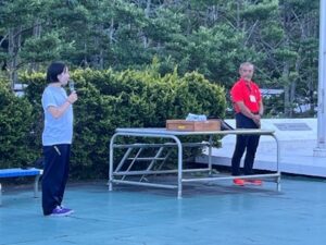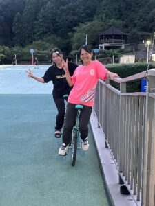 空いた時間を使って卓球、バスケットボール、一輪車等で学生同士、体を動かして交流しあい、楽しんでいました。